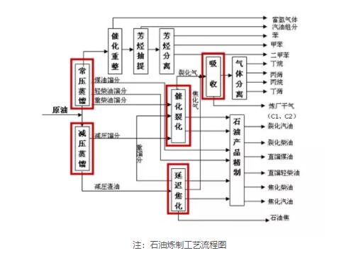 煉油廠主要生產裝置通常有:原油蒸餾(常、減壓蒸餾)、熱裂化、催化裂化、加氫裂化、石油焦化、催化重整以及煉廠氣加工、石油產品精制等。